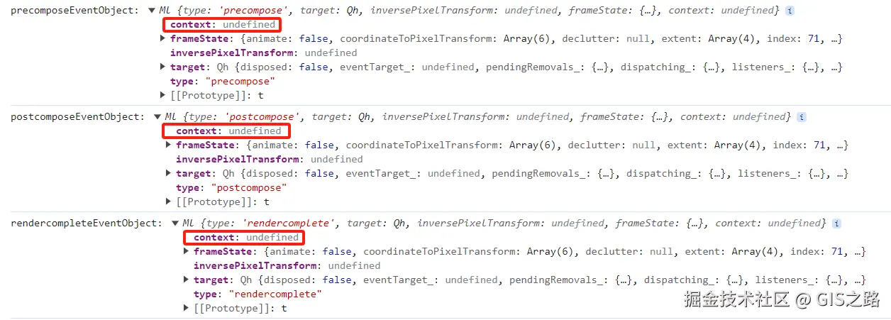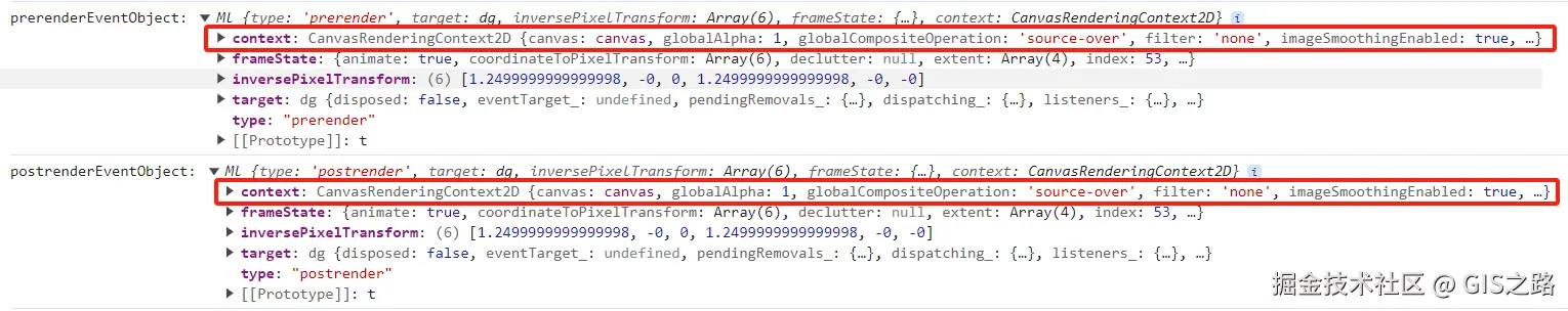 context{CanvasRenderingContext2d、WebGLRenderingContext、undefined} | canvas画布上下文对象。当事件由地图(map)触发时不可用,对于Canvas 2D图层,context将是2D渲染上下文;对于WebGL图层,context将是WebGL上下文 |