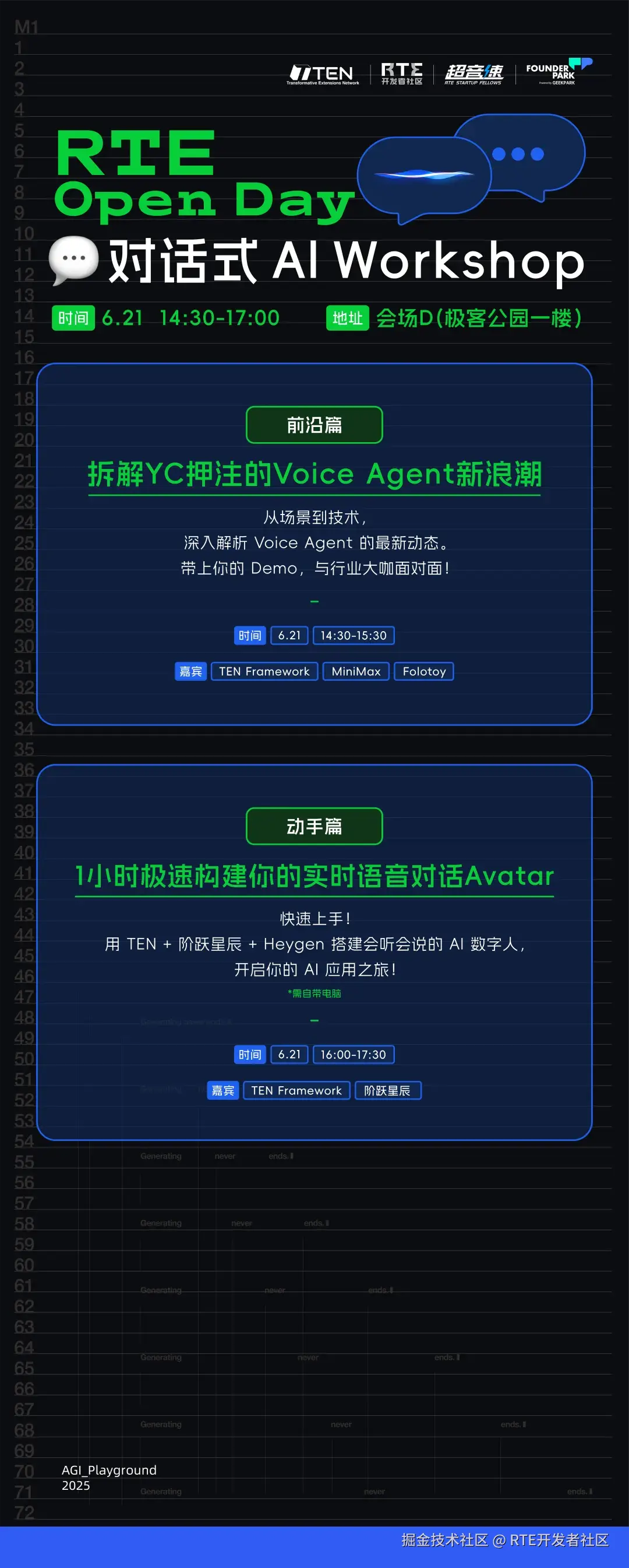 从社区成长起来的 TEN Framework 开源框架也将邀请了 MiniMax、Folotoy、阶跃星辰 等伙伴,一起举办两场 对话式 AI workshop ,邀请你拆解 Voice Agent 行业前沿,并动手打造属于自己的实时语音对话 avatar!