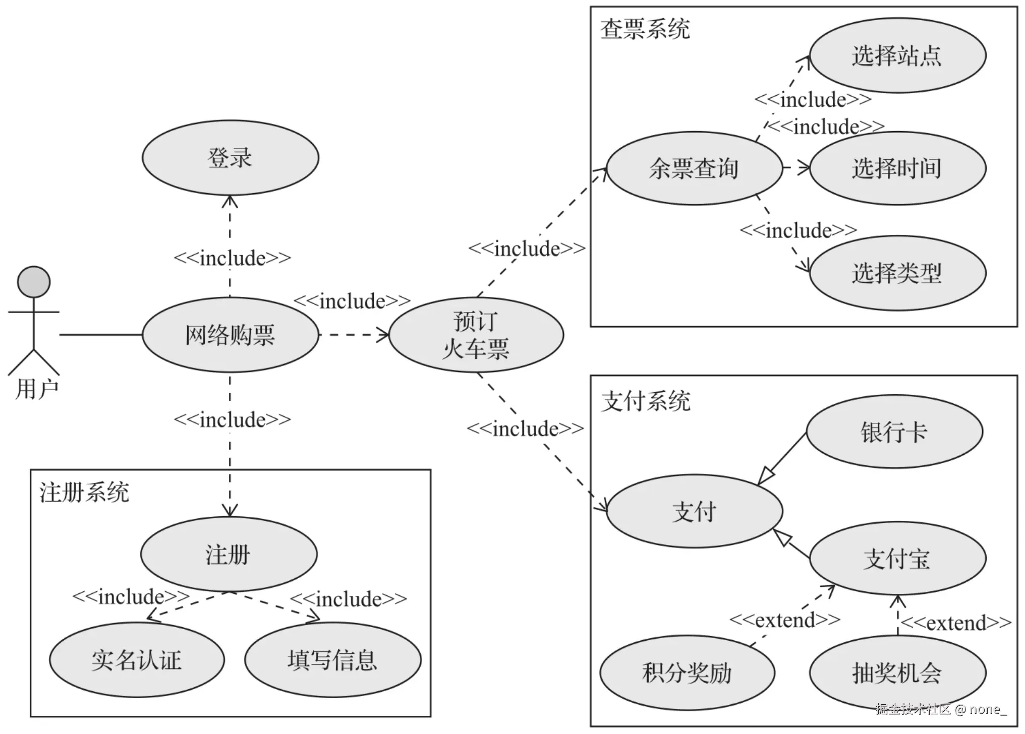 - 用例的编写原则:编写用例应从参与者的角度,分析和考察待开发系统的行为,并通过参与者与系统之间的交互关系描述系统对外提供的功能特性。