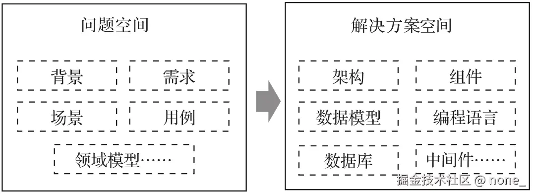 - 解决方案空间:通过具体的软件技术手段来进行系统设计和实现。