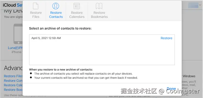 请按照以下步骤恢复您的 iCloud 联系人: