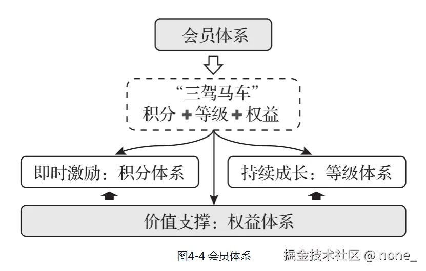 - 以会员体系为例:会员体系中包含权益体系(图4-4),权益体系包含权益投放(图4-5),权益投放域与其它功能域的协作关系(图4-6)