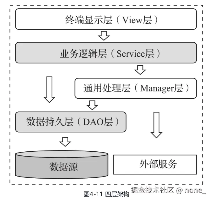 - 四层架构:终端显示层(View)、业务逻辑层(Service)、通用处理层( Manager)、数据持久层(DAO)