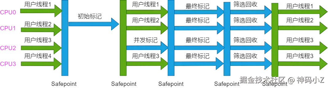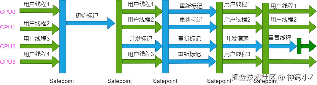 - 并发标记:与用户线程并发,标记所有可达对象