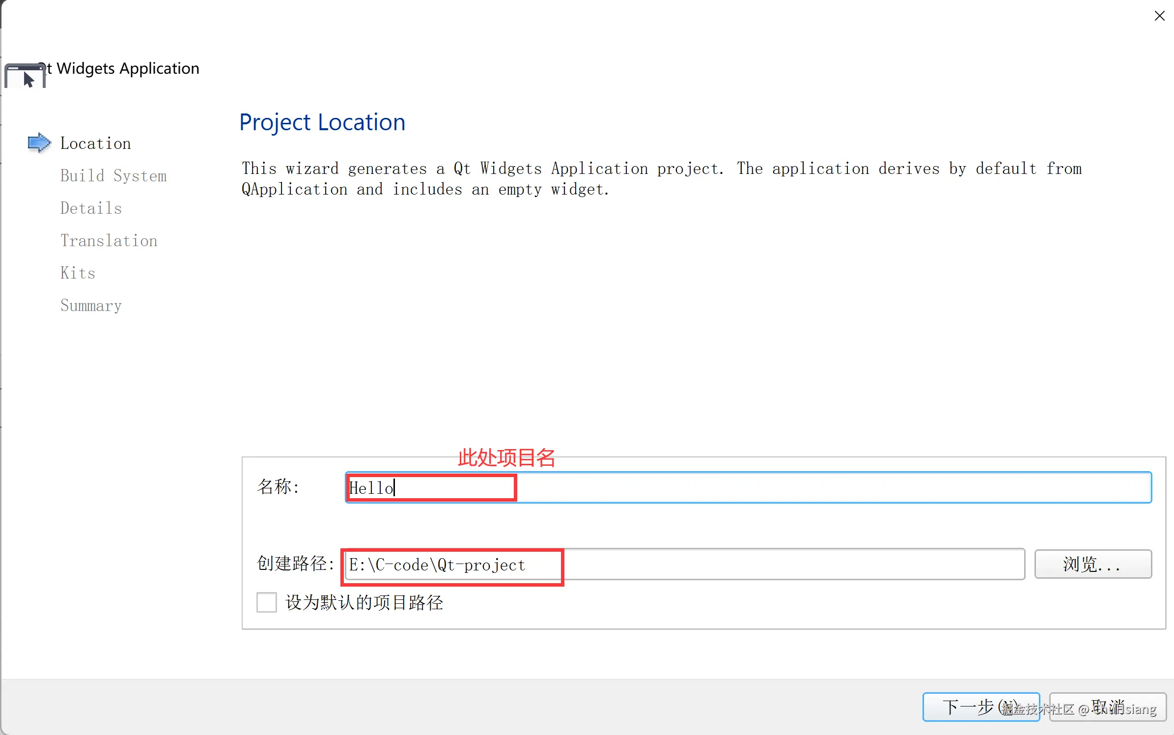 选择Qt Widgets Application模板后,接下来显示下图的新建项目导向,主要是设置项目名和项目存储位置。