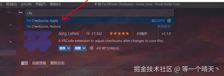 如果不行,我们还可以通过插件来解决,在扩展中搜索“Fix VSCode Checksums”,下载,然后我们点击ctrl+shift+p,点击Fix Checksums: Apply,在重启vscode就可以解决了,(个人觉得这种方法比较好,以防后面出现不必要的麻烦)fix.PNG
