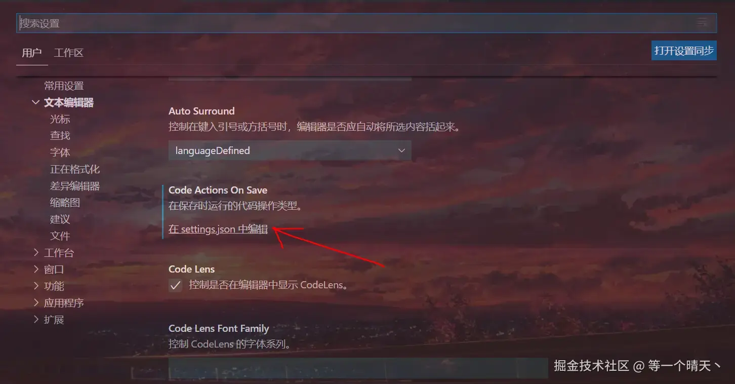首先打开设置(ctrl+,),找到Code Actions On Save,或者直接在顶部搜索,点击在settings.json中编辑