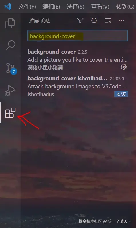 打开编辑器左侧的扩展,搜索background-cover插件,点击下载,然后以管理员的身份重新打开vscode