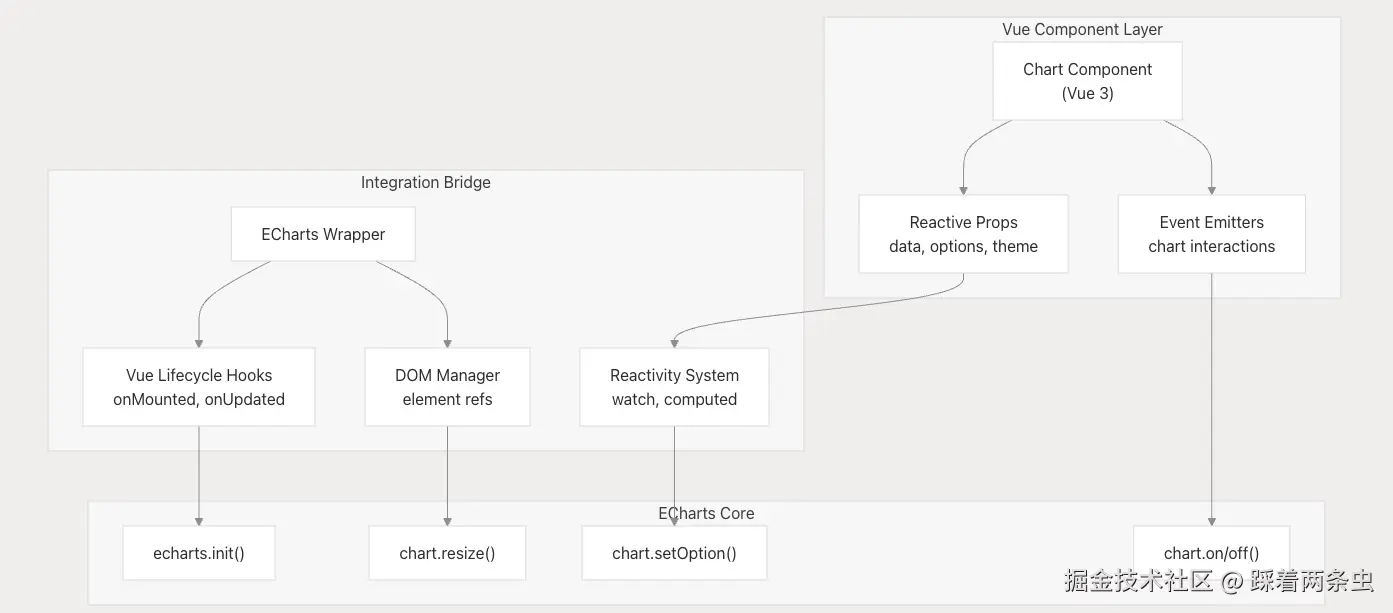 该包为 ECharts 提供了一个复杂的包装器,在保持 Vue 3 响应性的同时,保留了对完整 ECharts API 的访问。此集成处理图表生命周期、数据绑定和事件管理。