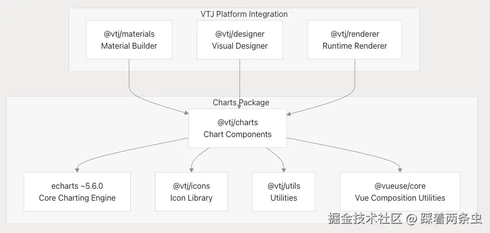 @vtj/charts 包是 VTJ 组件生态中的主要可视化层,基于 ECharts 5.6.0 构建,作为其核心图表引擎。该包提供了 Vue 3 组件,这些组件封装了 ECharts 功能,同时保持了与 VTJ 低代码设计模式的兼容性。