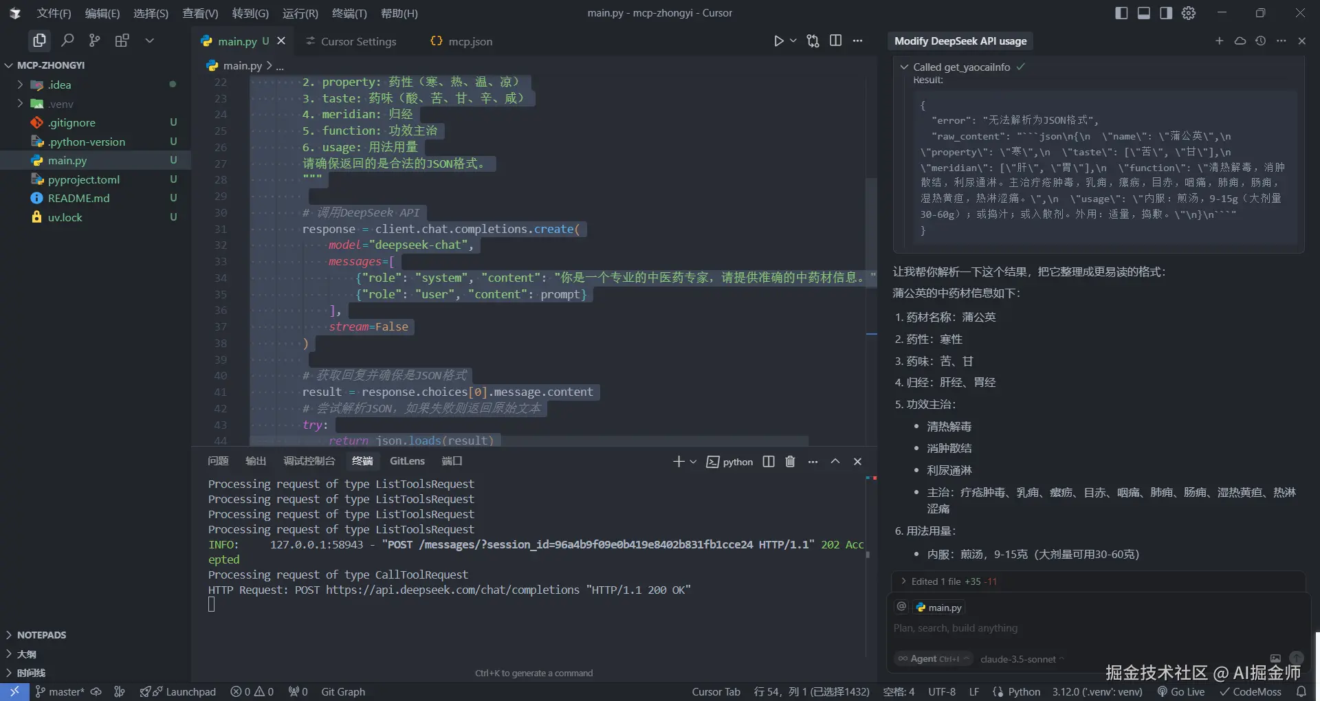 uv init mcp-zhongyi // 执行uv init mcp-weather命令初始化项目