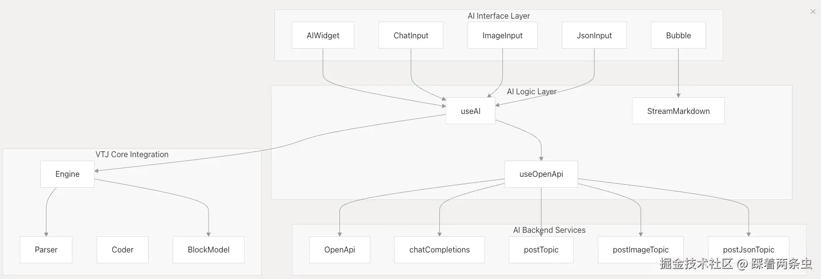 AI 系统通过分层架构运行,其中接口组件收集用户输入,逻辑层管理状态和 API 通信,后端服务处理 AI 处理。生成的代码直接与 VTJ 的核心引擎集成,用于解析和渲染。