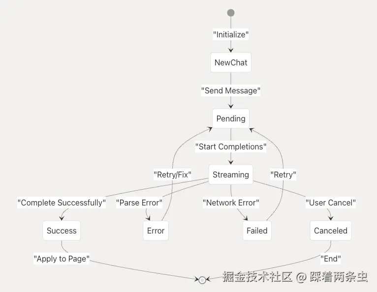 聊天系统通过结构化状态机维护对话状态,该状态机处理流式响应、错误恢复和用户交互。