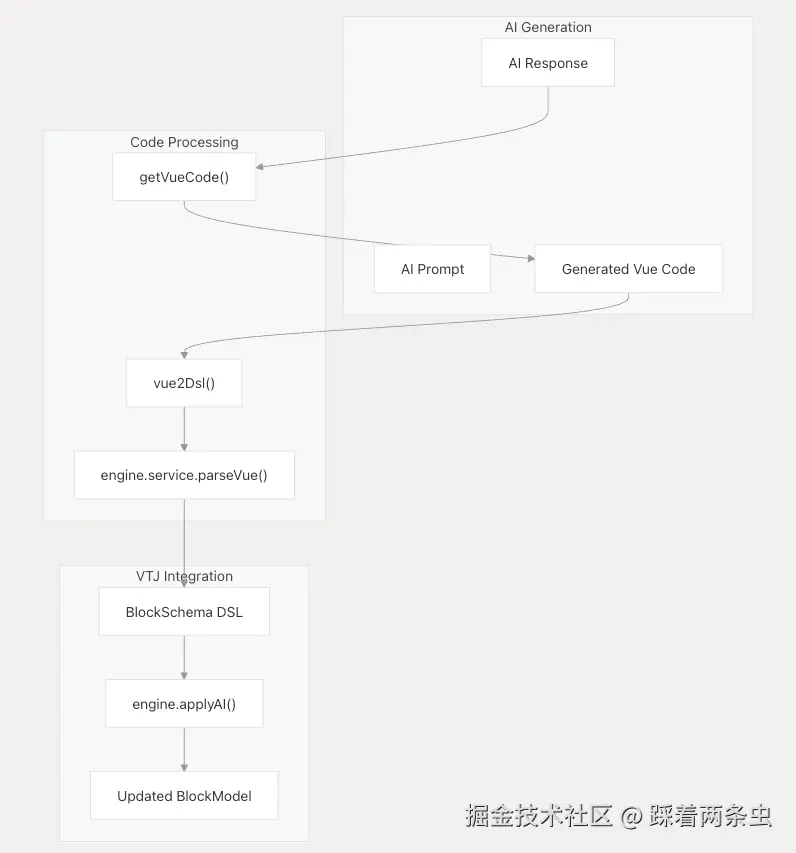 代码生成管道从 AI 响应中提取 Vue 代码,将其解析为 VTJ 的 DSL 格式,并将更改应用于当前块模型以进行即时渲染。