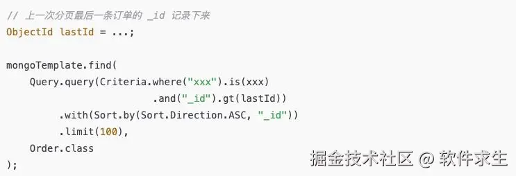每次分页的时候,我们只需要记住上一次的 _id,下一次从它往后继续查即可。性能直接起飞!