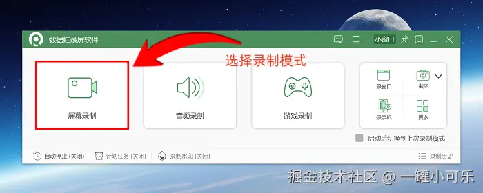 步骤1:笔记本电脑怎么录屏?点击数据 蛙录屏软件,进入软件页面,然后在页面中选择合适的录制模式。这款软件有屏幕录制、游戏录制、音频录制等模式,今天我们分享的是 “屏幕录制” 模式。
