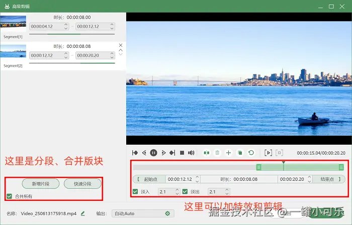 步骤3:录制结束后,可以先不着急点击保存,而是打开 “高级剪辑” 工具,对视频进行后期编辑操作。如快速分段、合并视频,删掉不需要的视频片段等。
