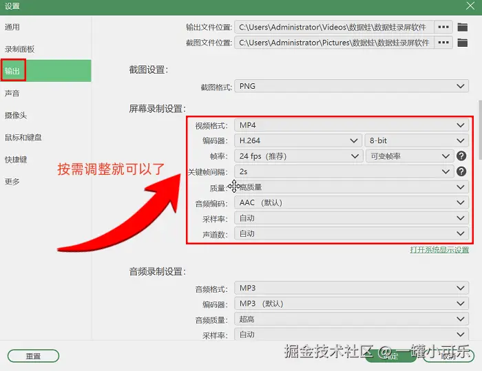 步骤2:在软件的左边选项中,我们可以选择 “全屏录制” 或者 “自定义区域录制” 。接着就可以自由选择合适的音频源了。如果你对录制视频的格式、帧率等有特殊要求,还可以点击“输出设置”去调整一下。调整完成后,就可以点击红色的 “录制” 按钮录制视频了。
