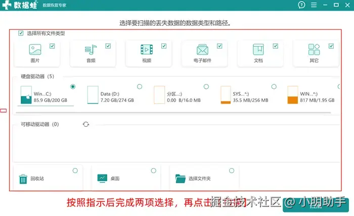 步骤1: 在电脑中打开数据 蛙恢复专家,在首页上按指示完成选择,点击【扫描】;