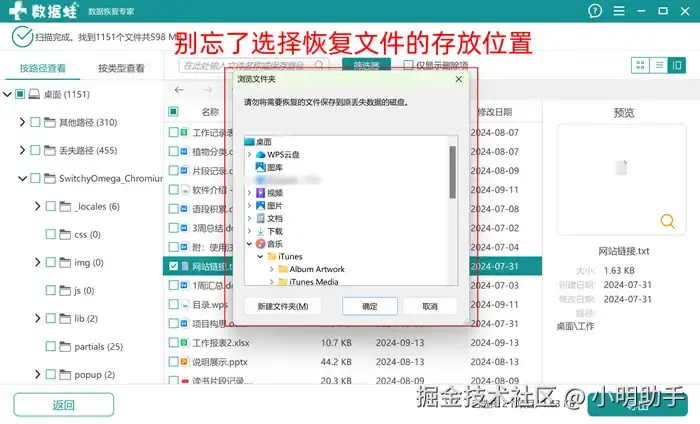 步骤3: 在点击完【导出】还没有结束,还需要选择恢复文件的新存放位置。