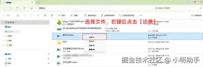 打开【回收站】后,找到自己需要恢复的文件,按下右键后点击【还原】。