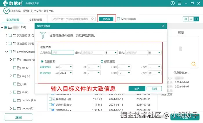 步骤2: 在扫描出来的可恢复文件中选择需要恢复的文件,扫描文件过多可选择使用【筛选器】,找到文件并点击勾选后再按下右下角【导出】的按钮;
