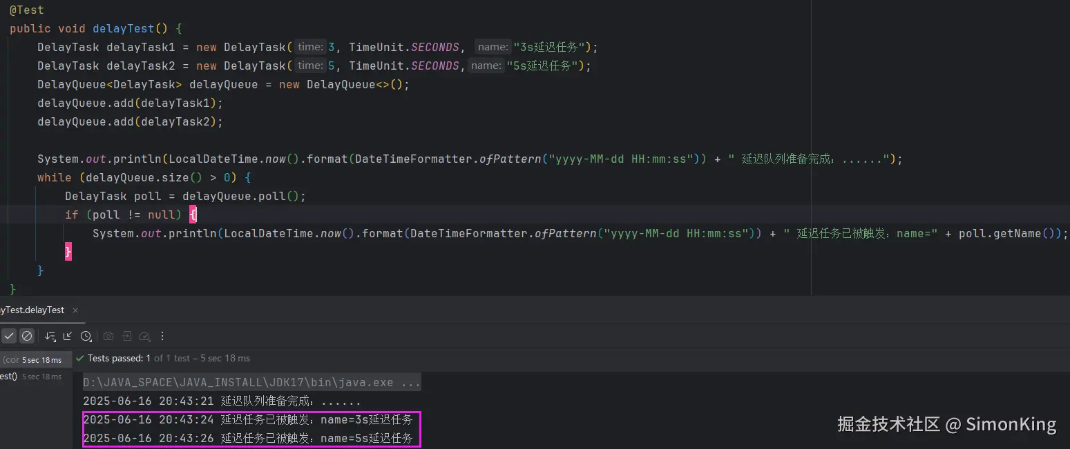 基于JDK的延迟队列是最简单的实现方式,无需任何第三方依赖。只需要实现java.util.concurrent.Delayed接口即可。