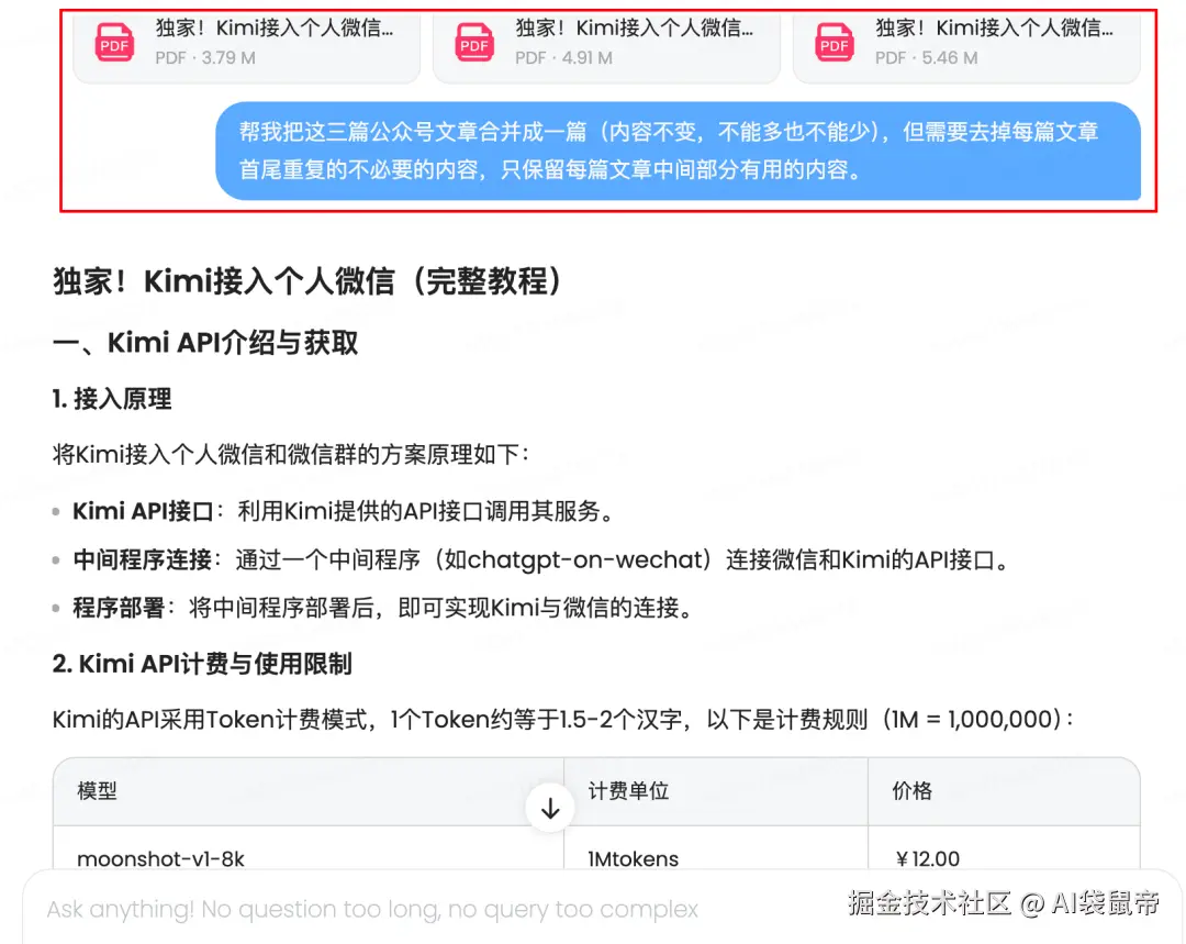 我把我去年写的kimi接入微信一、二、三丢过去,让MiniMax-M1合并文章的同时也"掐头去尾"。