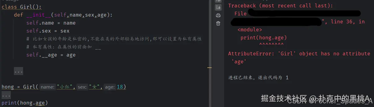 2.用法:只能在类的内部访问,不能在类的外部访问.可以在类的内部设置一个对外开放的接口,(这个接口一般会设置各种条件判断,满足后才能访问).主要用于私密信息.