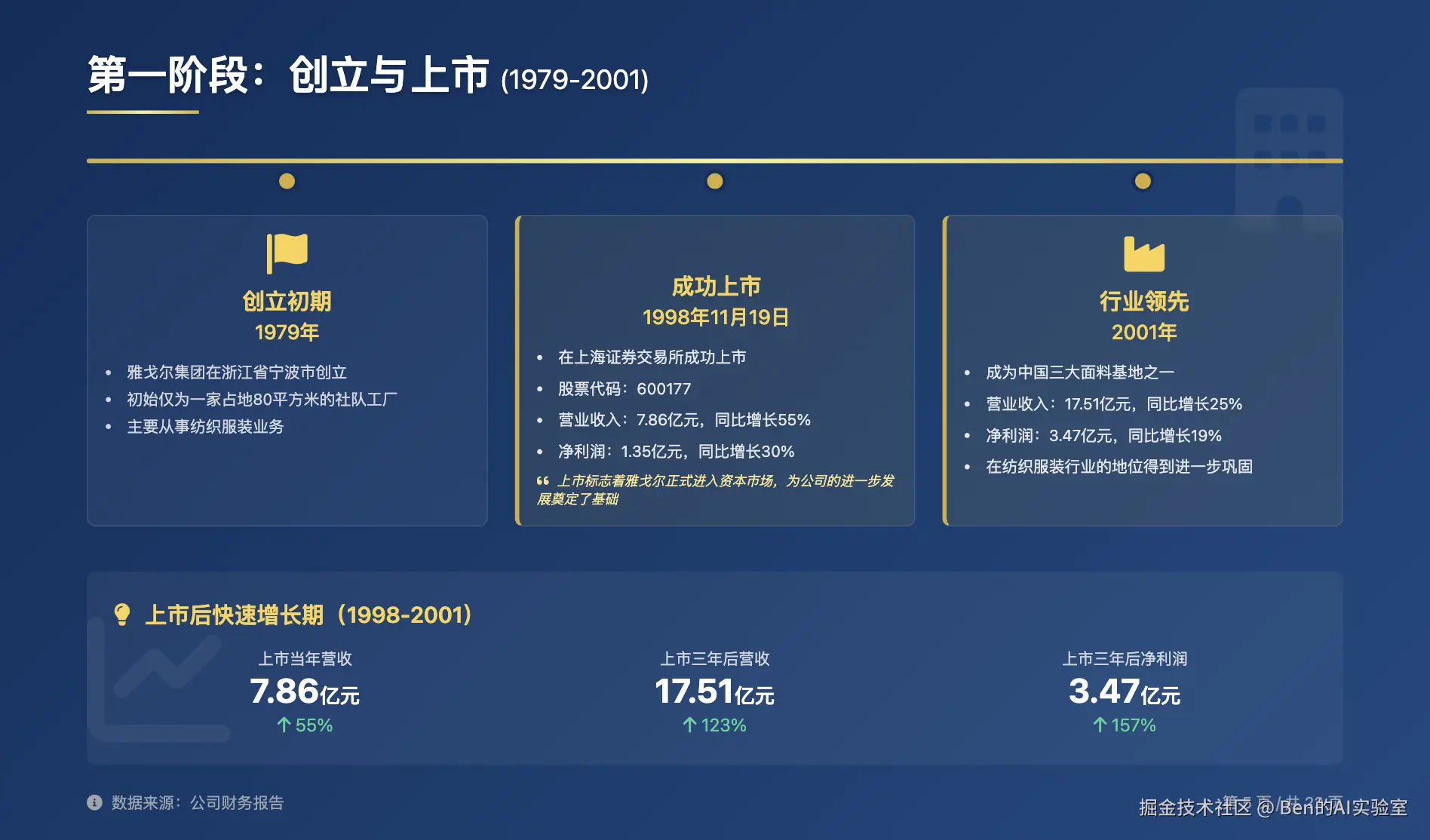 我让它做了份《雅戈尔集团三十年历程回顾》的PPT,AI一口气生成了22页,我节选了7页,大家可以感受下: