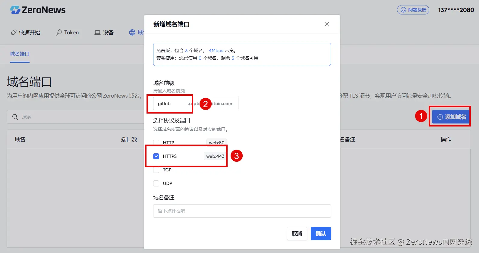- 域名前缀: 用户输入定义的 域名前缀,如 gitlab