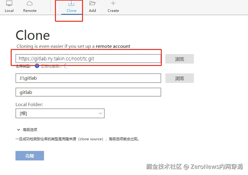 打开SourceTree,点击"新增-Clone",根据提示输入GitLab的账户和密码。