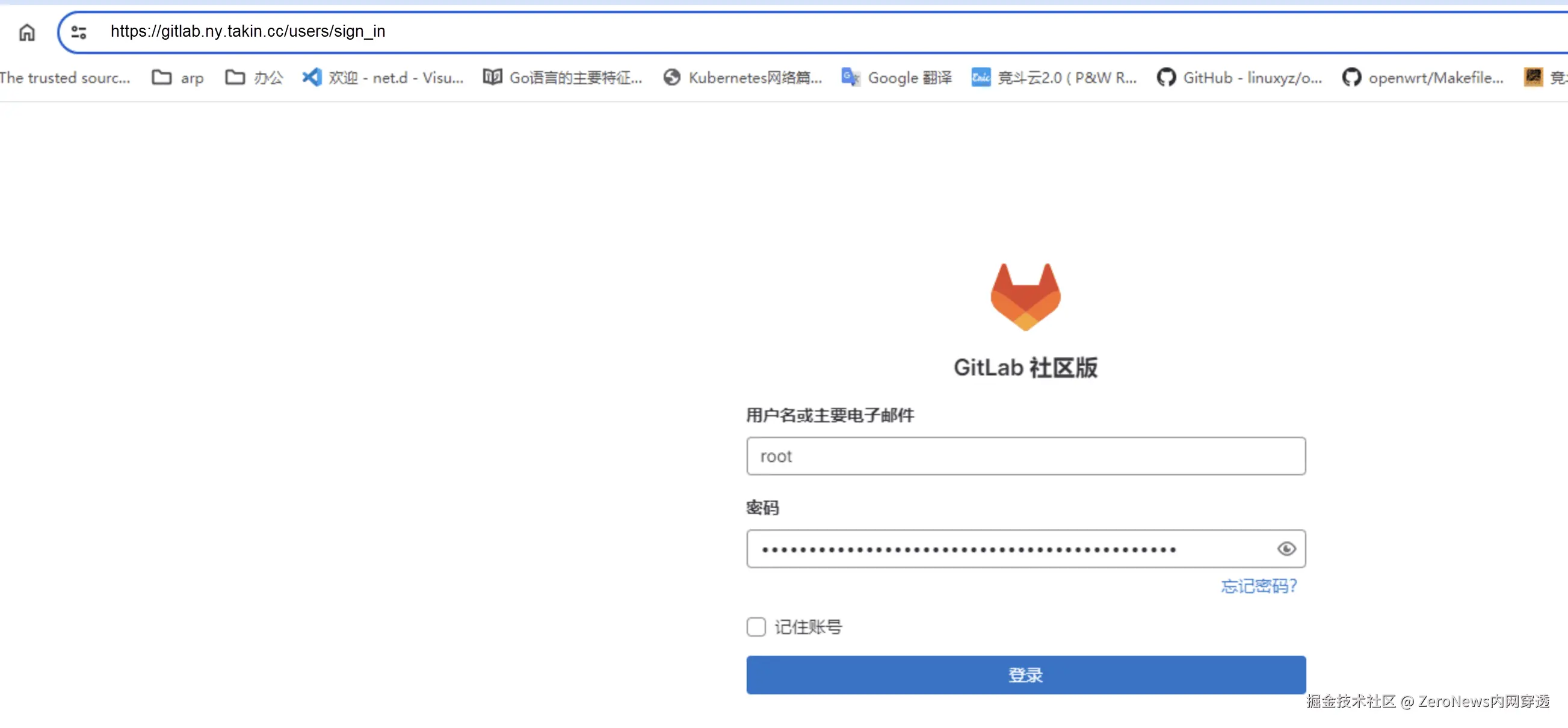 点击GitLab映射的访问地址后面的打开小图标,自动在浏览器中打开GitLab管理平台,输入用户名和密码登录。