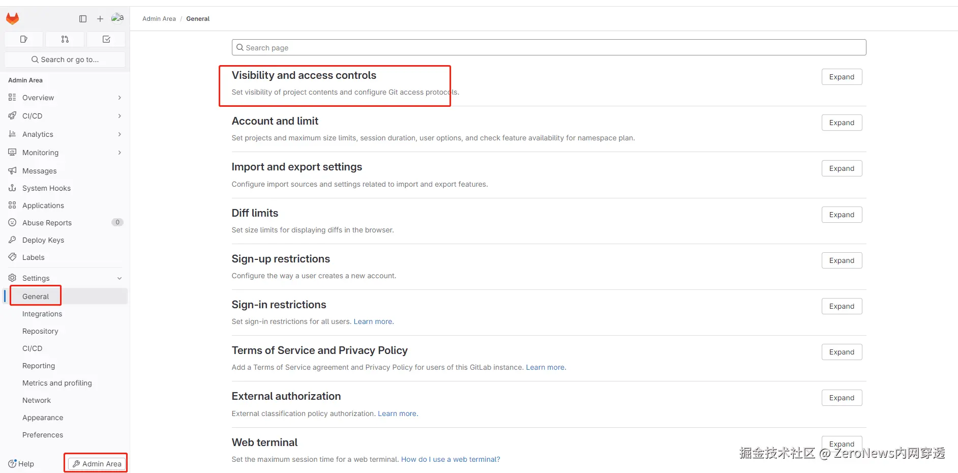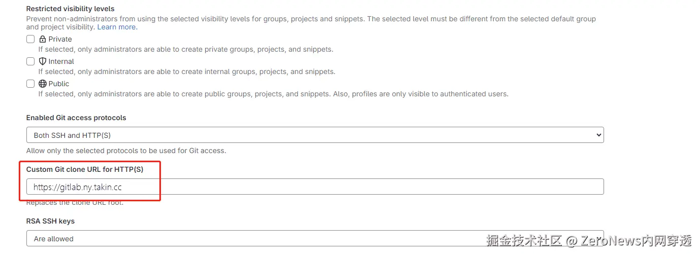 在"Visibilityand Access Controls" 部分,将GitLab的公网域名地址填入"CustomGit clone URL for HTTP(S)"。