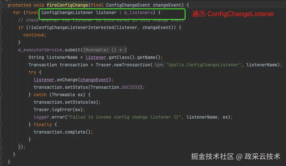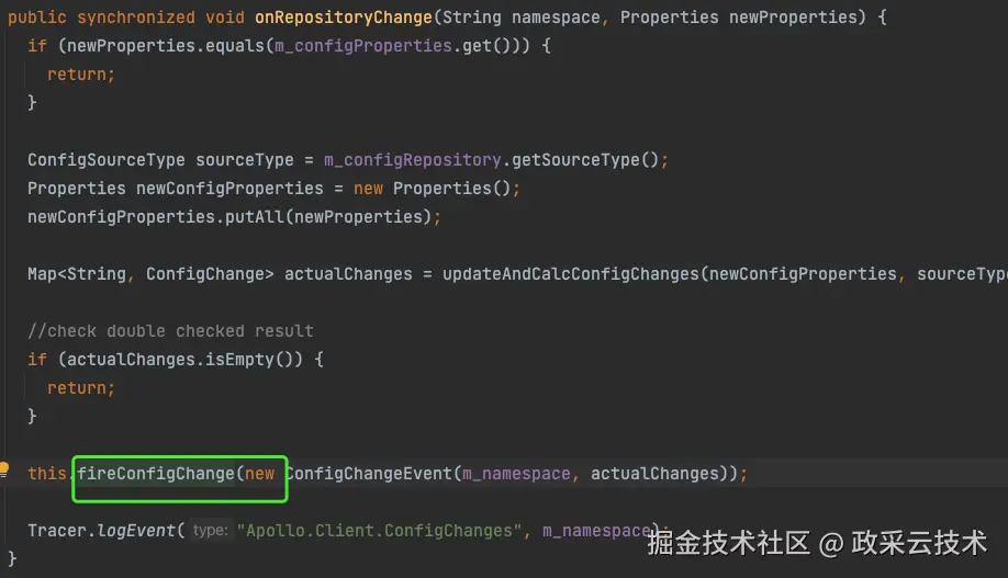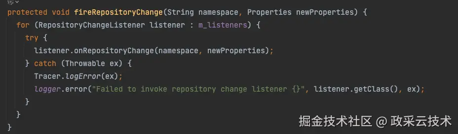 经过这段代码处理,如果有change事件,我们通过@ApolloConfigChangeListener自定义的listener就会收到消息了。