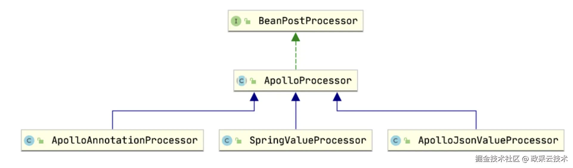 ApolloProcessor是一个抽象类,实现了BeanPostProcessor接口,负责在Bean初始化之前(上面配置处理之后),注入Apollo的配置,并把Spring的@Value抽象成对象,注册到Apollo自己的一个单例SpringValueRegistry中,方便后续的配置更新。首先看下类继承关系: