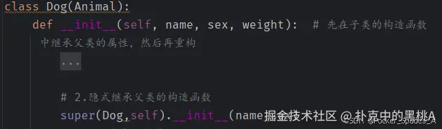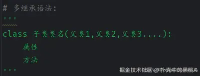 语法:在子类中继承父类只需要在定义子类时,参数列表中写上父类的名称即可.