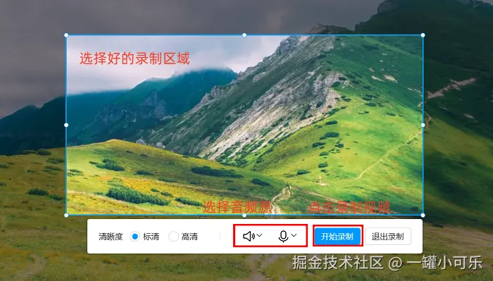 步骤3:完成录制区域和声音设置后,点击录制框上的 “开始录制” 按钮,就可以开始屏幕和声音的录制了。