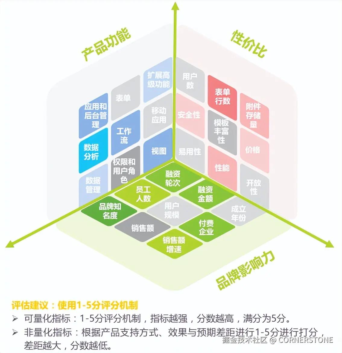 产品功能的评估主要聚焦于其功能覆盖的全面性与丰富性。具体的一级指标涵盖数据分析管理、表单设计、工作流编排、视图呈现、权限与用户角色管理、移动应用开发支持等关键领域。