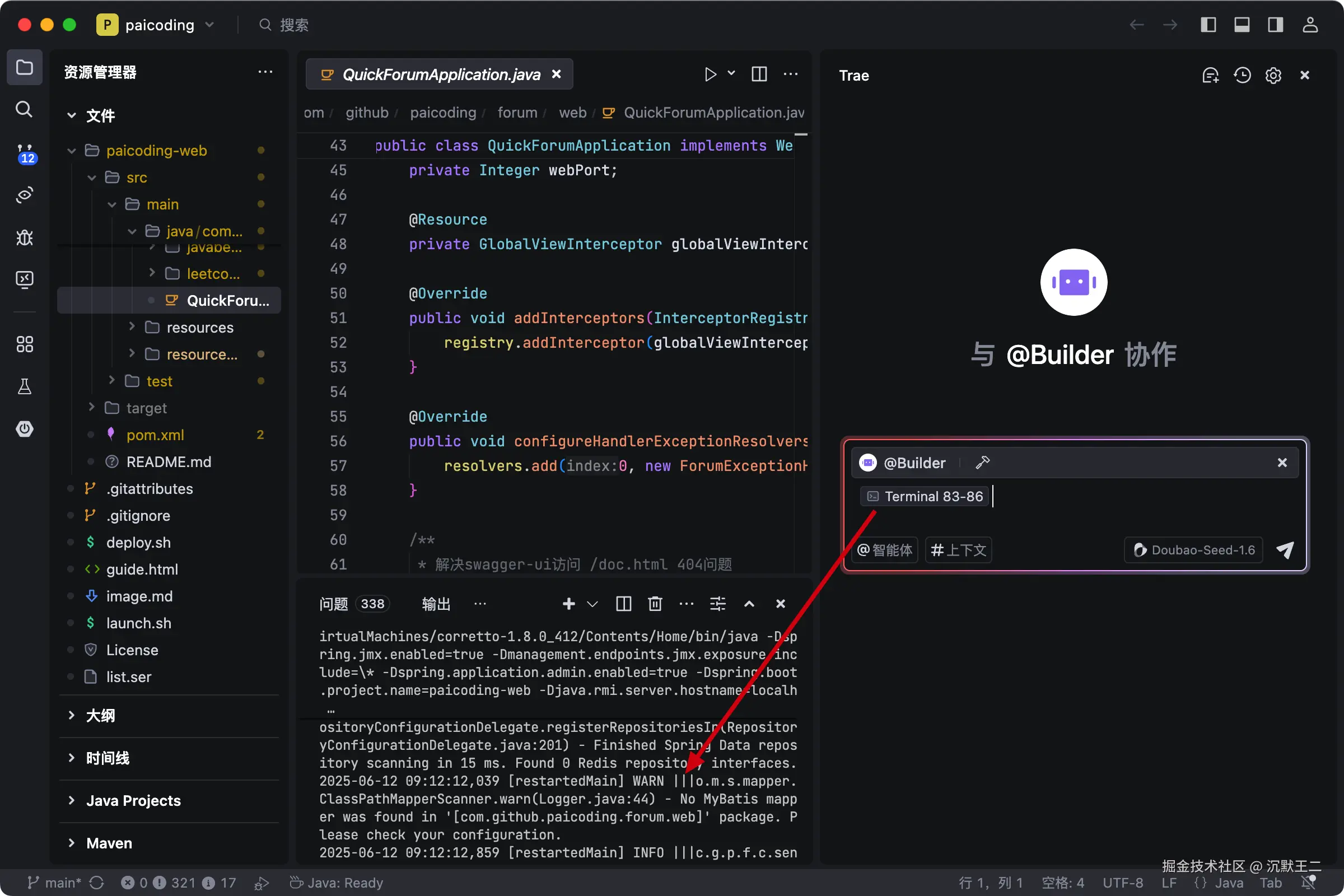 但现在不一样了,打开 Trae,运行 paicoding 这个项目,然后把错误信息添加到上下文的聊天环境中,分分钟搞定,我给大家演示一下。