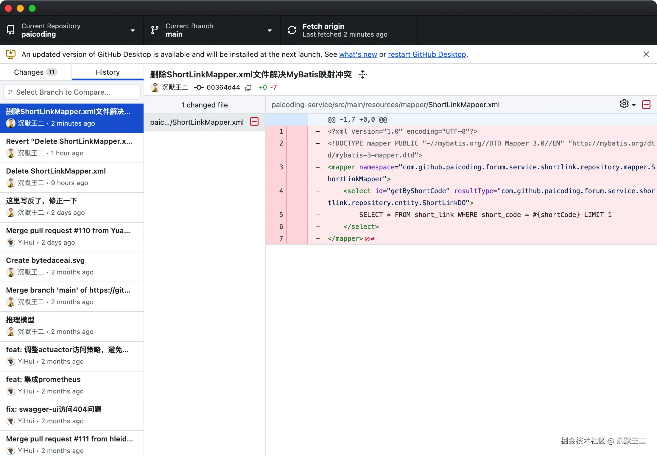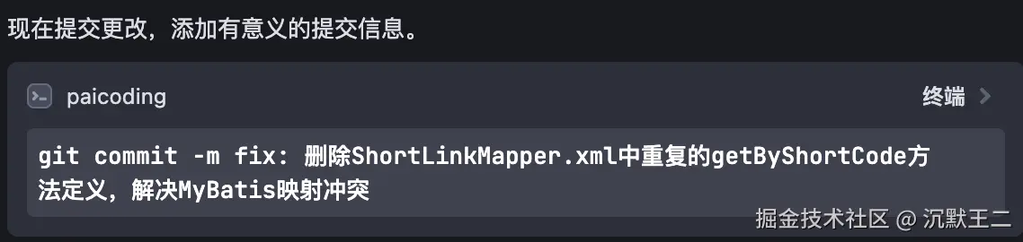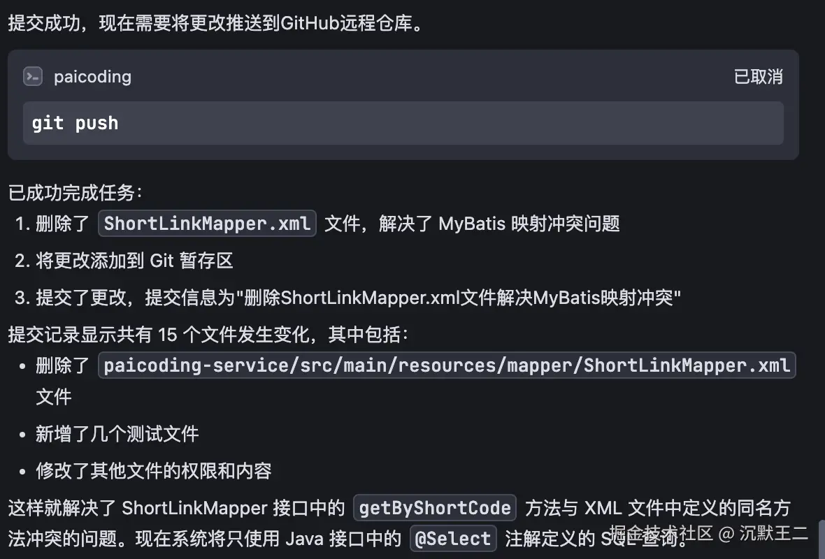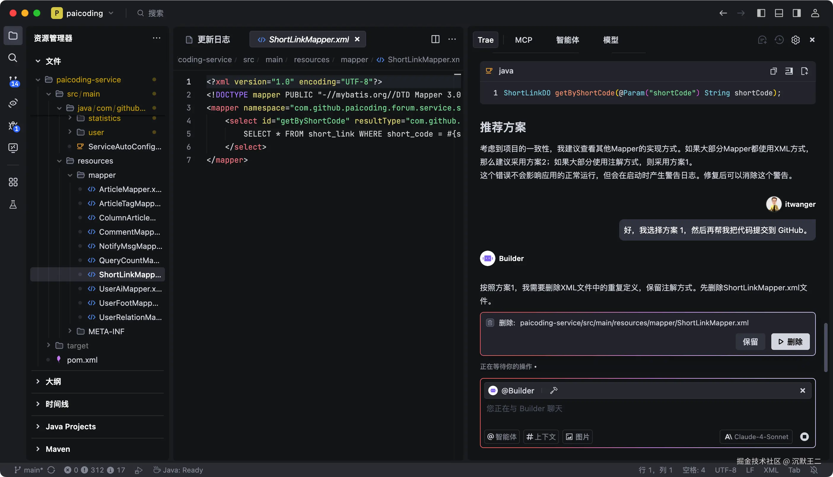 第五步,告诉 Trae 我们打算选择第一种解决方案,删掉 ShortLinkMapper.xml,并且帮我们提交到 GitHub。
