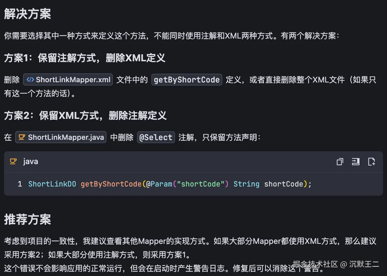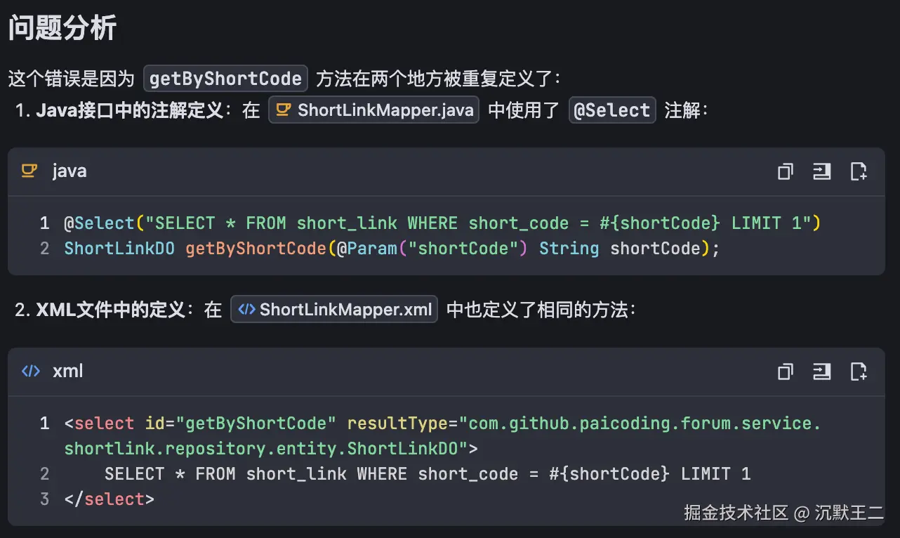 第三步,我们再把 ERROR 的信息添加到对话,再次回车,这次我们发现,代码确实写的有点问题,因为 mapper 接口中我们已经通过注解的形式定义了 SQL 查询方法,但 xml 中又再次定义了一次。