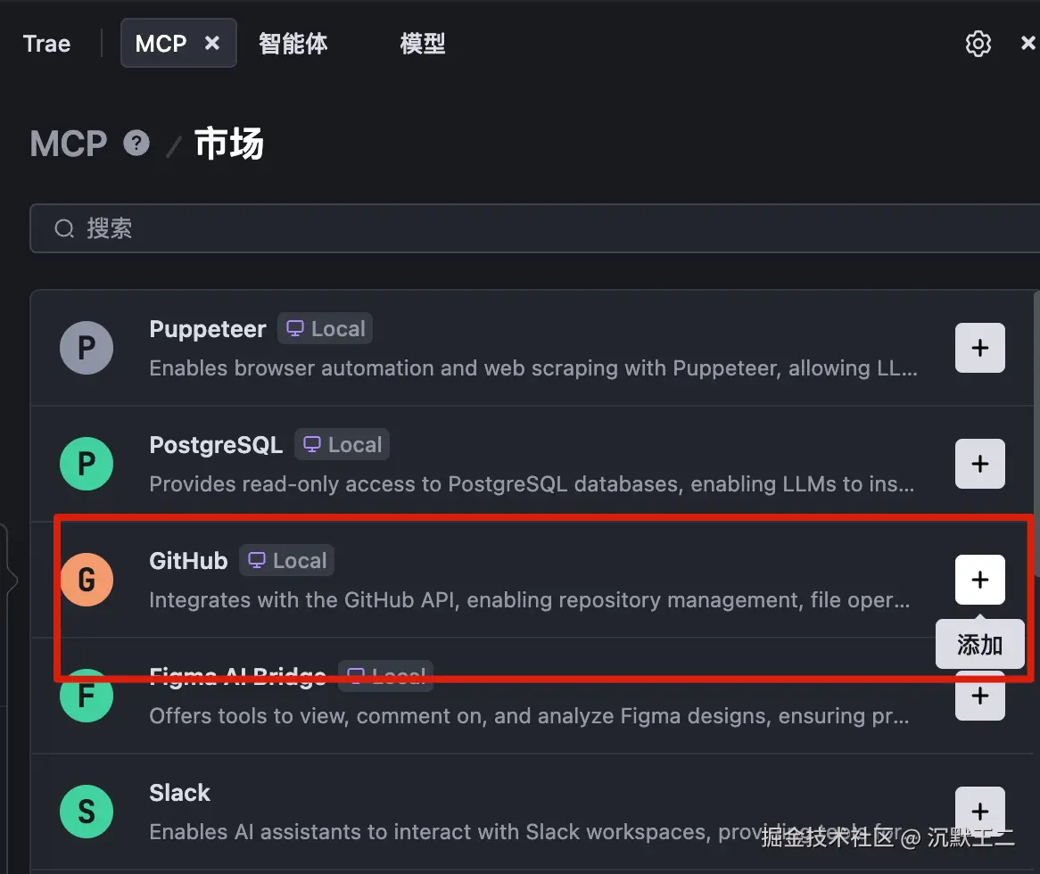 第一步,点击【MCP】,找市场找到 GitHub 的 MCP Server,点击添加的小图标。