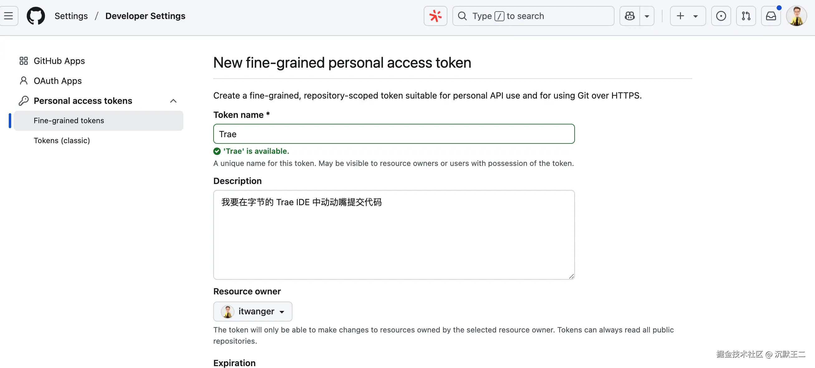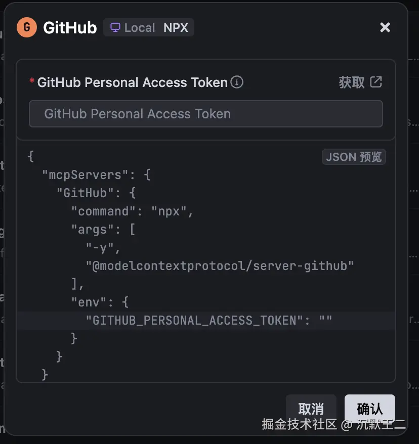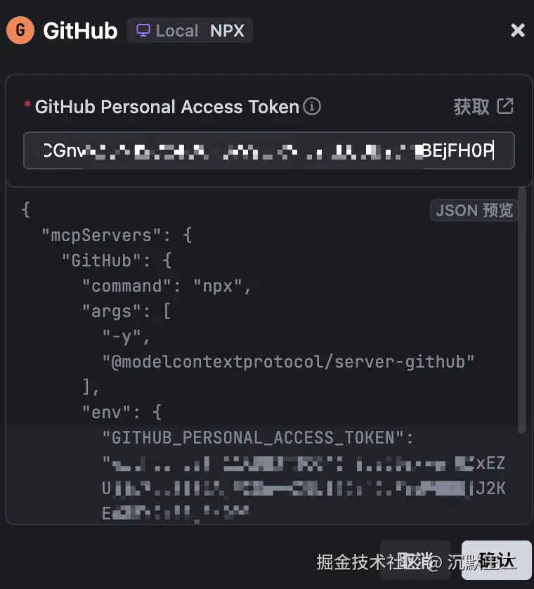 第四步,回到 Trae 的 MCP 对话框,输入刚刚复制的 token,就可以帮我们自动生成 GitHub MCP Server 的 JSON 配置信息。
