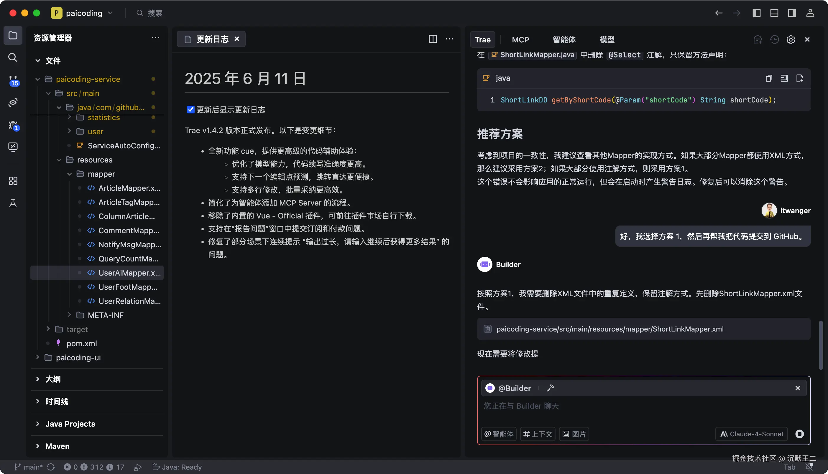 就我一个 Java 后端开发者来说,我已经深深被这款产品折服了,Trae 的产品体验已经可以媲美 IntelliJ IDEA 了。
