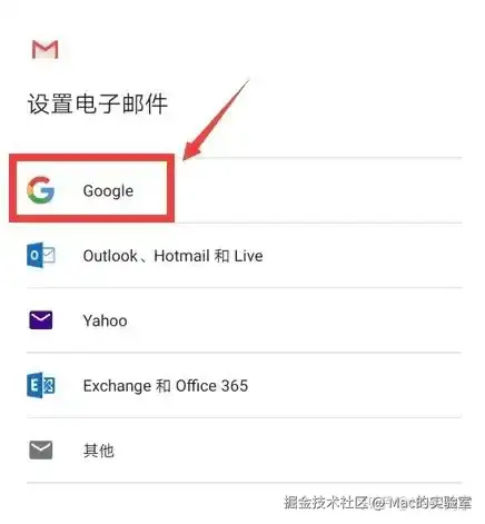 步骤三:在“设置电子邮件”界面选择“ Google ”
