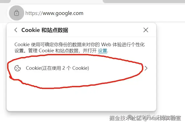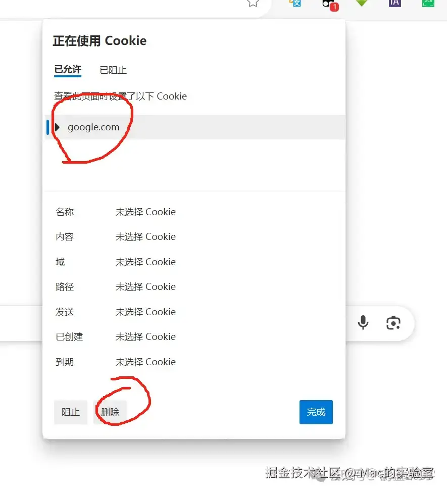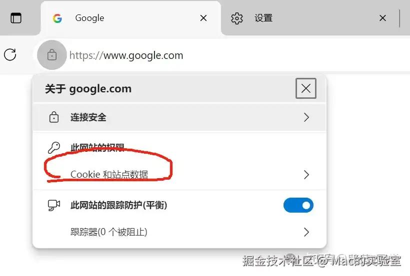 使用Microsoft Edge 浏览器,打开www.google.com,点击网站边上的小锁,选择COOKIE和站点数据,删除Cookie→google.com