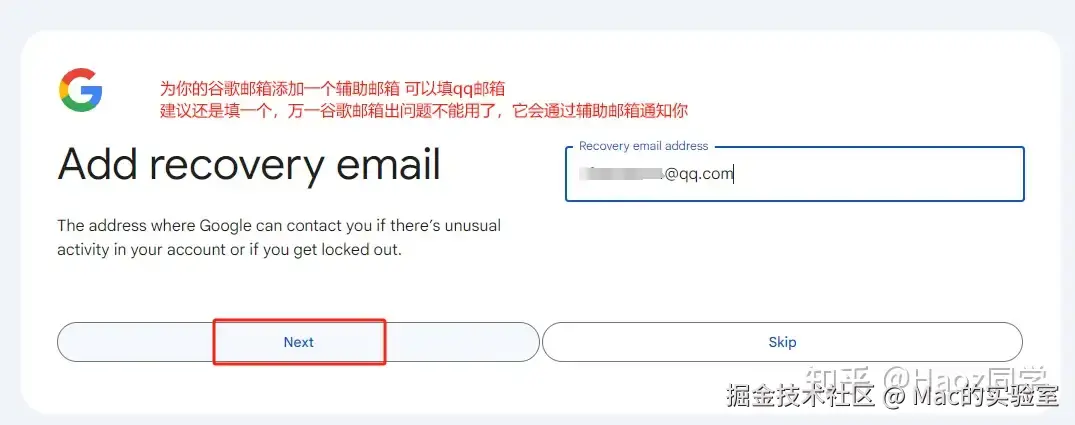 步骤六:添加辅助邮箱,点 Next,我们就完成注册了。