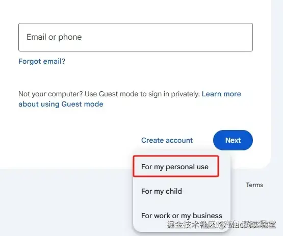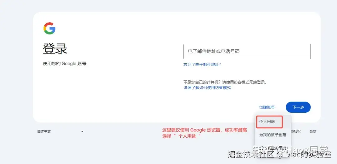 步骤一:打开 Google 浏览器主页,点击右上角”登录“,选择”创建账号“——”个人用途“,点击下一步。