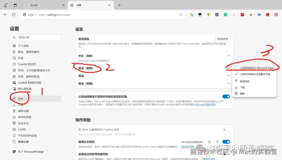 3、点击浏览器右上角的三个点选择设置→语言→英语(美国)→以这种语言显示 Microsoft Edge,重启浏览器。